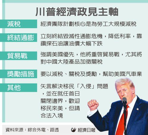 2024-07-22 经济日报国际中心/综合外电美国前总统川普18日在共和党全国代表大会上,接受共和党提名参选总统,并列举四大经济政见主轴:减税、终结通膨、贸易战及奖励措施,同时承诺会打击移民与边境。