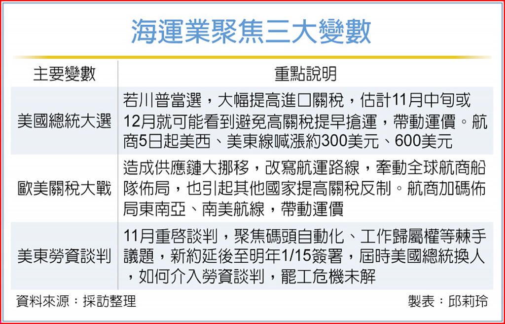 多位业界大老与货代业者表示,若川普当选,估计11月中旬或12月就可能看到为避免高关税提早抢运,带动短期运价。货代业者已接获通知,航商5日起美西线喊涨约300美元、美东线喊涨约600美元。