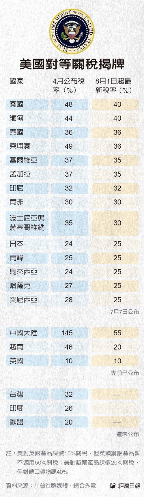 此举显示川普持续以威胁策略,利用近三周的缓冲期与各国协商。台湾、欧盟及澳洲等贸易伙伴的税率则还没公布。