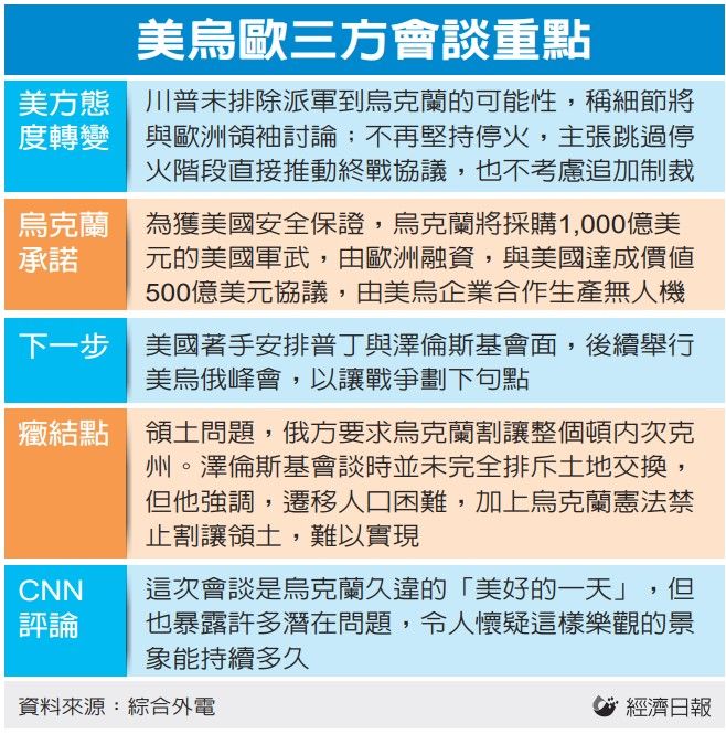 目前俄乌会谈时间与地点都尚未确定。德国总理梅尔茨说,可能在两周内登场;法国总统马克宏则暗示,三方会谈可能在三周内举行。欧洲官员透露,为获得美国安全保证,乌克兰承诺采购1,000亿美元的美国军武、由欧洲提供融资,并与美国达成价值500亿美元协议,由美国与乌克兰企业合作生产无人机。