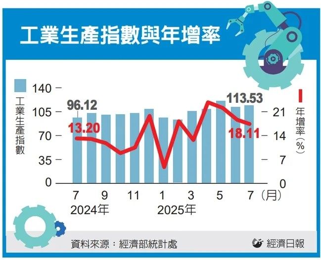 2025-08-27 经济日报/ 记者江睿智/台北报导AI商机持续火热,经济部昨(26)日发布7月工业生产指数113.53,年增18.11%,制造业生产指数114.22,年增19.55%,双创历年同月新高,皆呈连17个月正成长。不过随下半年进入高基期,制造业生产指数增幅将趋缓。