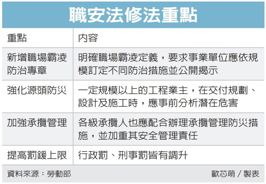 劳动部表示,透过修法,希望将工安预防全面化,要求工程从新建到分包,都需重视与提升工安;另也推动职场霸凌防治法制化,营造友善职场。