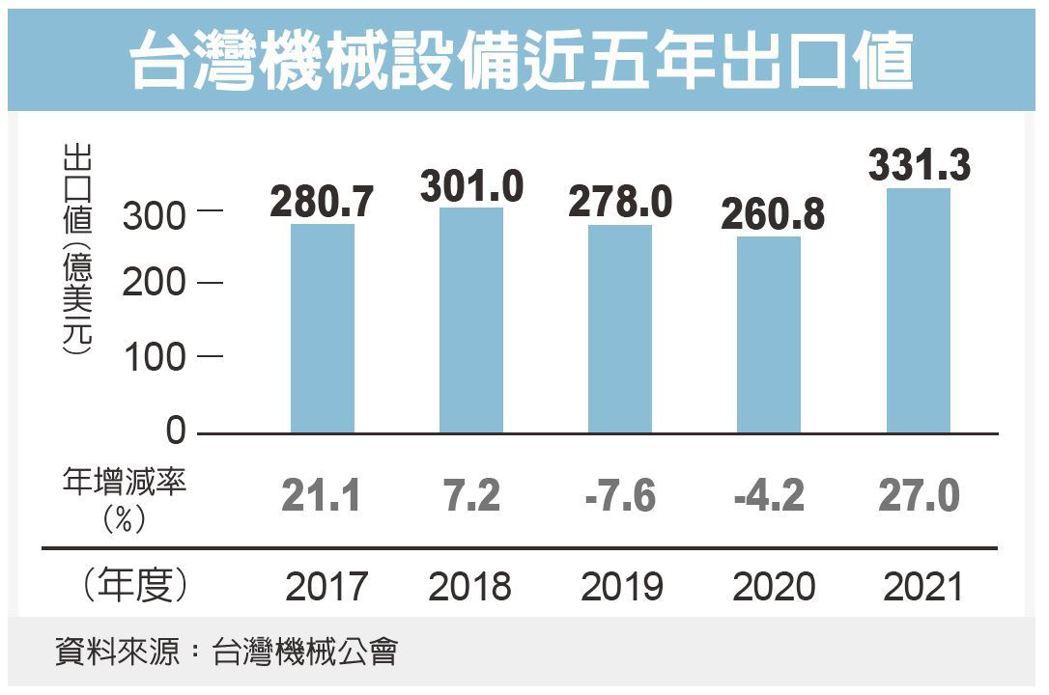 台湾机械公会昨(10)日公布2021年机械设备出口值为331.38亿美元,较2020年成长27.0%,创历史新高;以新台币计价约9,283.49亿元,年增20.3%,也创新高。公会指出,机械设备已连续12个月呈双位数增长,显示台湾机械产业景气持稳复苏。