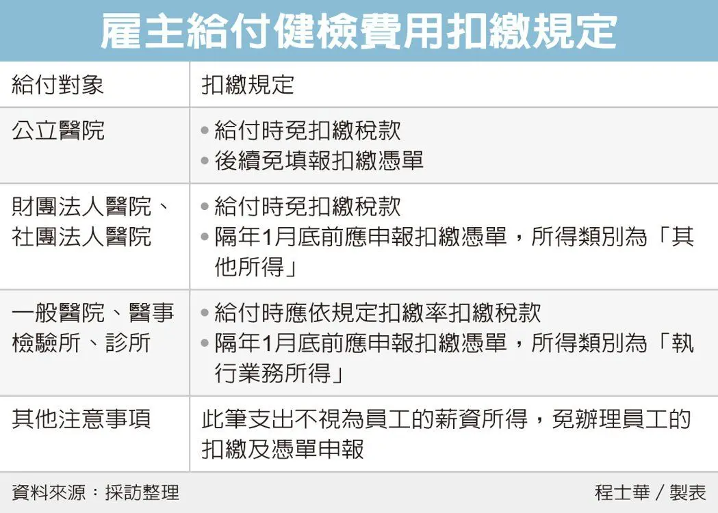 企业办理员工定期健康检查,依合作的医疗院所不同,税务扣缴规定有别,高雄国税局表示,若是与公立医院、财团法人医院合作办理员工健检,给付时款项时可以免除扣缴义务;但若是找一般医院、私人诊所合作,因为属于对方的执行业务所得,因而有扣缴义务。