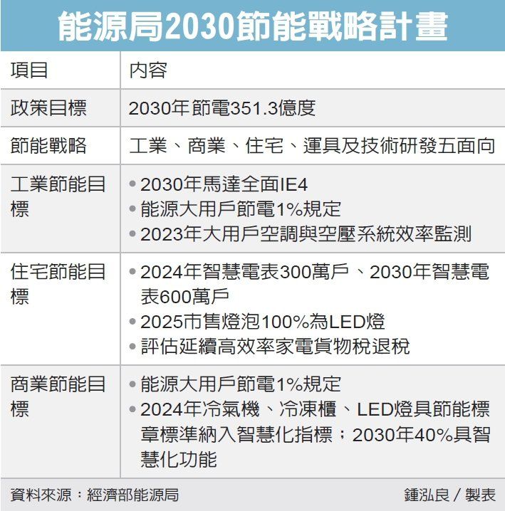 经部昨公布节能战略计画,透过六大推动策略、45项措施,就工业、商业、住宅、运具、 科技五大领域分别推动节能措施;节能战略将分阶段检视,预计2030节电目标为351.3亿度电,工业大约占将近半、约49%,商业、住宅节电则相当。