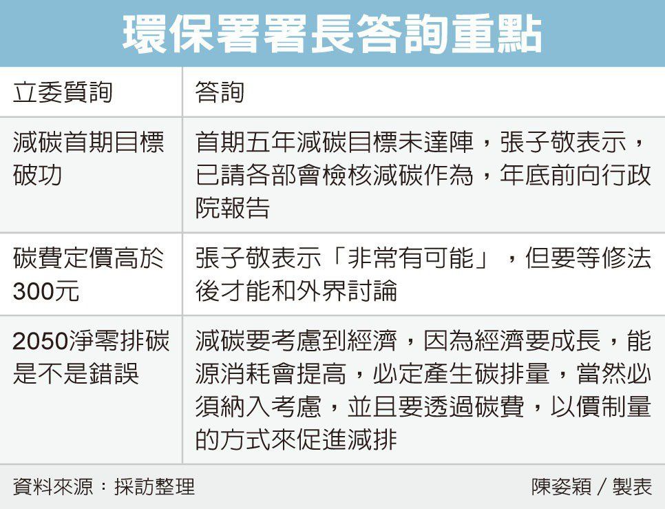 台湾最快2024年开征碳费,立委昨(5)日询问环保署长张子敬,未来每公吨碳费是否高出新台币300元?张子敬回应表示:「非常有可能」,但要等修法后才能和外界讨论。