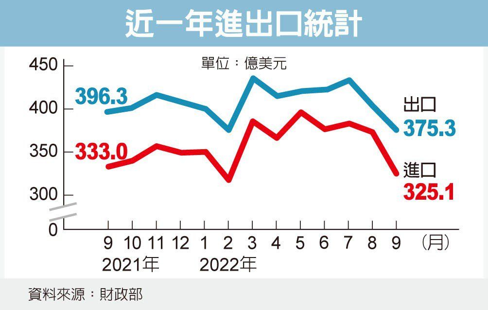 财政部上月公布9月出口375.3亿美元,排除2月春节因素,创今年最低水准,年减5.3%,除了是2020年2月以来最弱表现,也终结连续26个月正成长,出口由红翻黑。