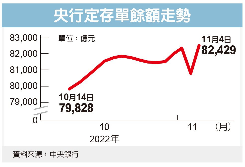今年以来,国内资金情势大翻转,央行采取三度升息、累计2码、两度调升存准率、累计2码等紧缩货币政策,加上热钱大举汇出、新台币汇率重贬,央行定存单水位陡降,今年10月中旬,央行定存单余额一度跌破8兆元大关,10月14日最低跌至7兆9,828亿元,意即,不过一年半,央行定存单余额便大减1.5兆元。