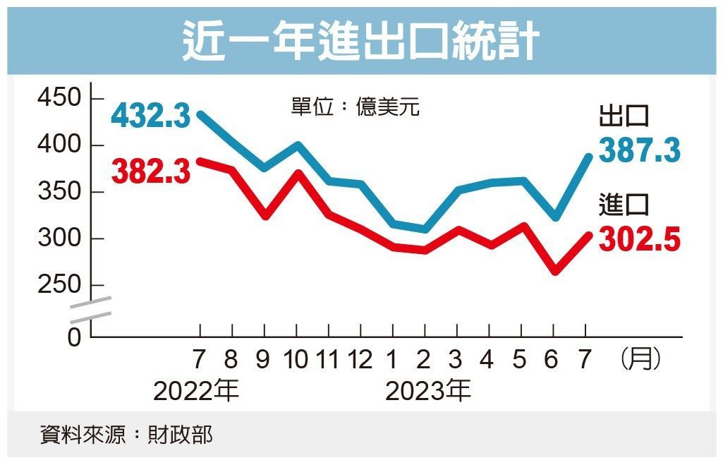 財政部上月公布7月出口387.3億美元,是九個月以來最高,年減10.4%雖為連11黑,但減幅縮小,表現優於預期,主要受惠於AI商機。財政部樂觀預估,第3季出口減幅將降至個位數,第4季將回歸正成長軌道。