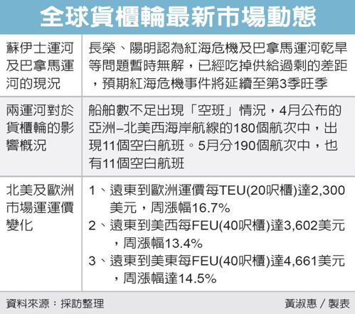 2024-04-29 經濟日報 記者黃淑惠/台北報導兩條黃金運河通行困難外溢效應發威,緩解貨櫃輪供應過剩的問題,貨櫃輪第2季開始出現「空班」情況,統計亞洲-北美西海岸4、5月各出現11個空白航班,估亞洲到歐洲5月開始也因船舶供給不足會出現空白航班,加上船舶集中到四大航線,排擠到南非、南美需求,都造成運價上漲。