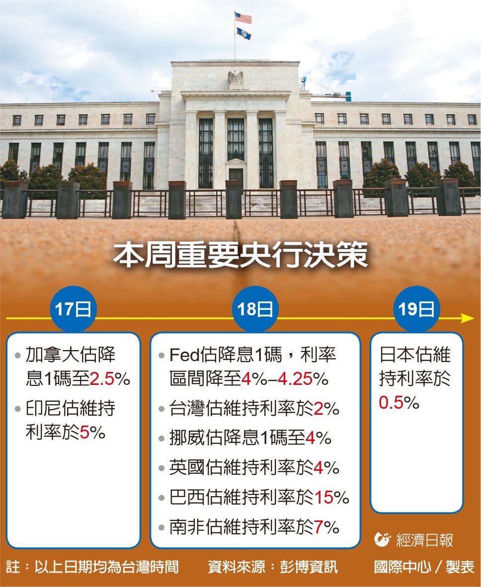 最受矚目者當屬Fed在台灣時間18日凌晨2時出爐的決策,預料將降息1碼,基準利率區間降至4%-4.25%,但將出現至少一票的異議票,包含希望降息2碼的官員、以及希望按兵不動的官員,凸顯Fed利率決策小組聯邦公開市場操作委員會(FOMC)內部歧見之深。