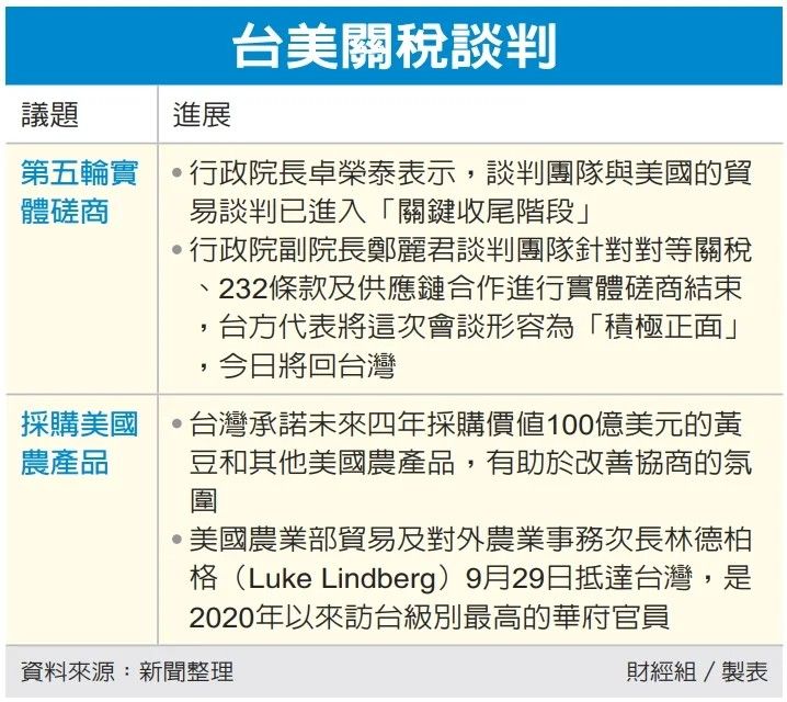 2025-10-01 經濟日報/ 編譯 葉亭均 、記者 歐芯萌 、 余弦妙 /綜合報導彭博引述知情人士指出,台灣經貿談判代表人員上周抵達華盛頓,與美方討論調降對台灣課徵的20%關稅稅率等議題。雙方這次討論議題之一是台灣對美國投資。這位知情人士也說,台方官員也尋求為台灣半導體產業爭取有利待遇。