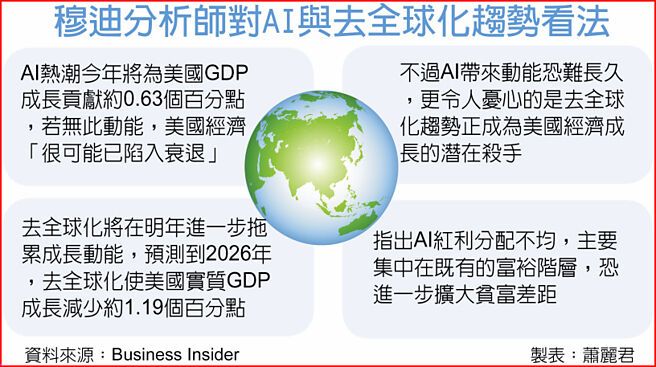 2025-11-14 工商時報 陳彥綺、綜合外電儘管AI熱潮帶動美國經濟與股市持續上揚,但穆迪分析公司(Moody’s Analytics)首席經濟學家贊迪(Mark Zandi)並不樂觀,他表示,令人擔憂的是,「去全球化」趨勢正成為美國經濟成長的潛在殺手。