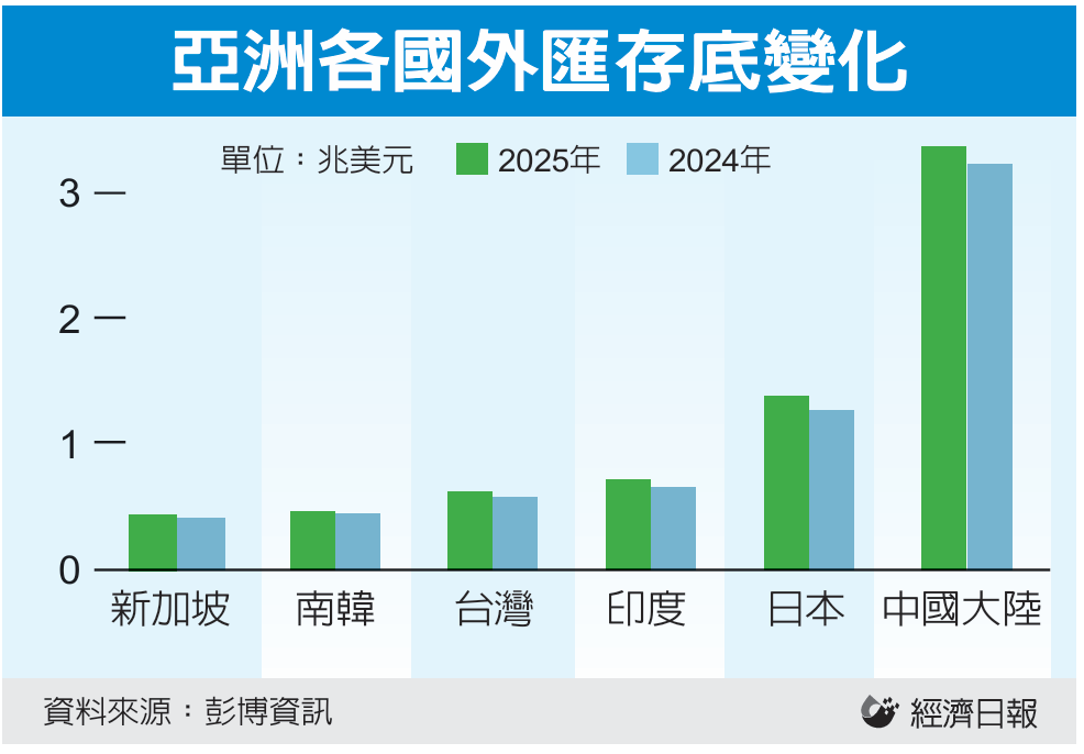 2025-11-21 經濟日報 編譯任中原/綜合外電亞洲11個主要經濟體的外匯存底總額,今年增加逾4,000億美元,已逼近8兆美元,主因是美元貶值與金價大漲。因此,儘管最近亞幣普遍走軟,但各央行已擁有更充裕的彈藥在必要時捍衛本幣匯率。