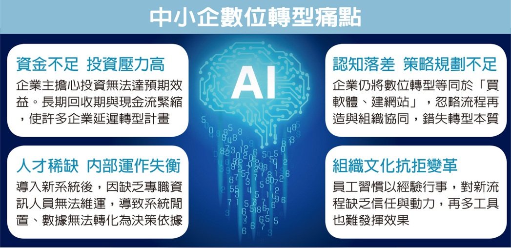 2025-11-24 經濟日報 李瑋珊在AI與雲端技術驅動下,數位轉型已不只是口號,而是企業能否持續競爭的關鍵因素。中小企業不僅是台灣經濟發展主力,更是社會就業的重要支柱。然而,面對市場快速變化、人才與成本壓力交織,若不積極推動數位化,勢必面臨被市場淘汰的風險。