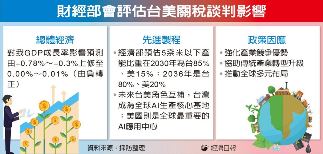 經濟部委託智庫評估顯示,關稅調降後,對台灣GDP影響由原先負值區間,改善為0.00%至0.01%,由負轉正,整體經濟衝擊顯著降低。