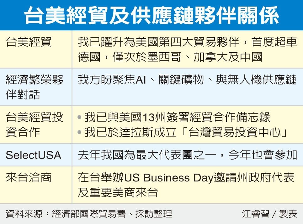 貿易署並表示,去年我國有104家業者赴美參加選擇美國投資高峰會,是全球規模最大代表團,今年我國也會組團參加選擇美國投資高峰會。此外,我國也會在台舉辦US Business Day邀請州政府代表及重要美商來台,便利業者在台洽談商機。