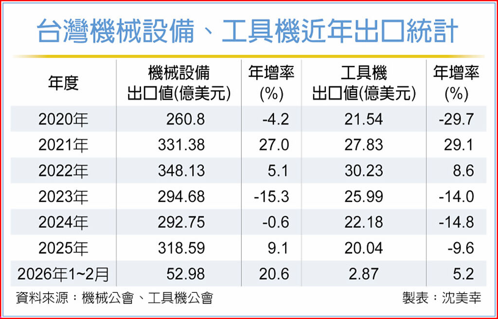 機械公會指出,2026年國際情勢驟變,受美國對等關稅生變、美以對伊朗爆發戰事影響,全球經濟發展充滿不確定性,雖然目前台灣機械出口穩定增長,但台灣機械以出口為導向,未來勢必受國際情勢影響,需持續密切觀察。