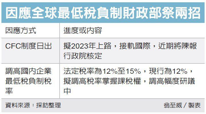 迎戰全球最低稅負制,財政部擬祭出兩招,目前正如火如荼研議。首先針對CFC(營利事業受控外國企業)制度,近期將報行政院核定自2023年上路;其次在國內最低稅負制稅率方面,正評估調高現行12%稅率,至於調高幅度尚未定案。