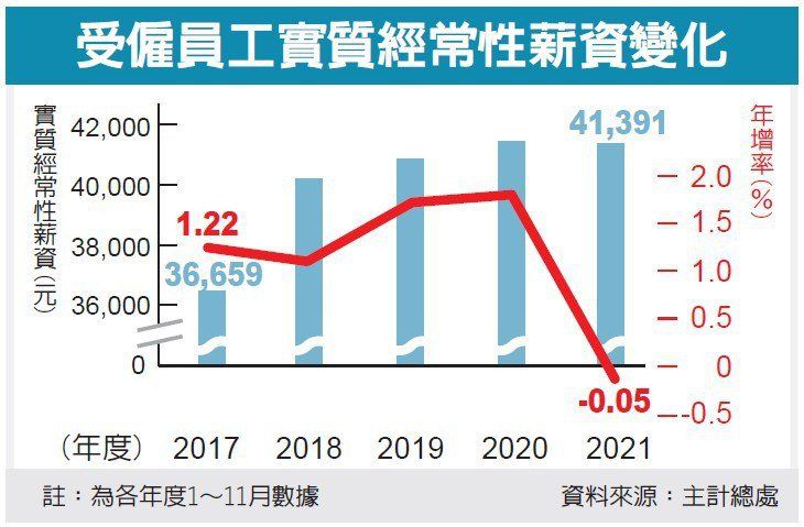 萬物齊漲,薪資成長也被高物價吃掉了。主計總處昨(10)日發布2021年1~11月全體受僱員工每人每月經常性薪資平均43,138元,年增1.86%,總薪資平均55,819元,亦增2.95%。但剔除物價因素後,實質經常性薪資為41,391元,年減0.05%,為2017年以來首度負成長。(延伸閱讀:主計總處:去年前11月實質經常性薪資衰退 5年首見)