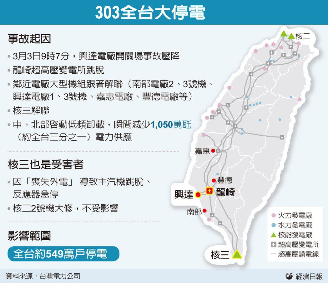 台電興達電廠昨(3)日上午9時7分突然發生開關場事故,供電瞬間壓降,導致電網減少三分之一供電能力,引發全台無預警大停電,半導體、光電、蘋果供應鏈、石化、鋼鐵等產業嚴重受創,估計損失恐高達上百億元;台電統計,至少549萬戶受停電影響。