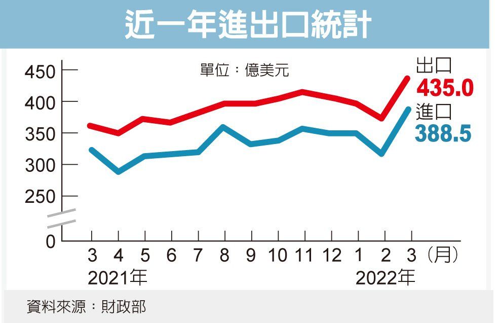 進口方面,3月同步以388.5億美元創下新高,年增20.3%,反映出口衍生需求與原物料行情齊揚。累計第1季出超154.8億美元,較上年同期增13.9億美元。