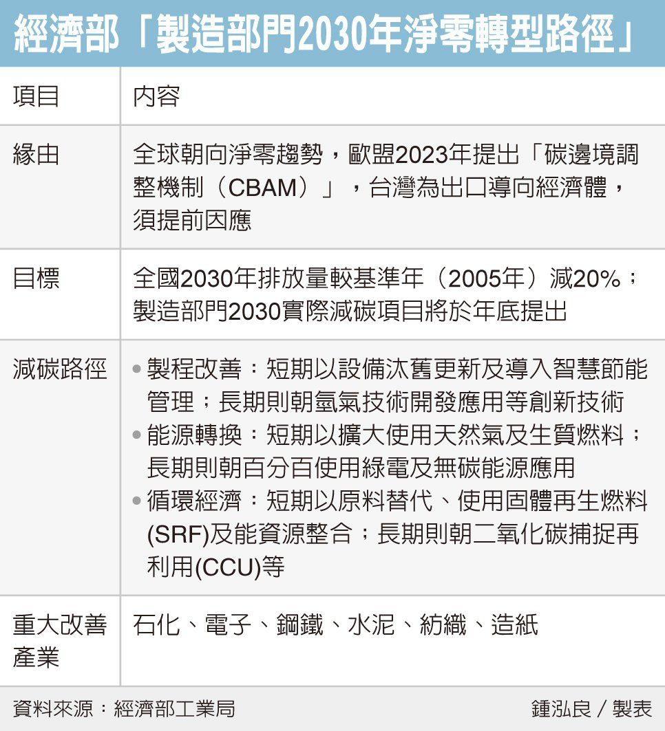 台灣為出口導向經濟體,面臨全球減碳風潮及規範,經濟部昨(7)日發布「製造部門2030年淨零轉型路徑」,提出各產業淨零轉型作法,並擬定石化、電子、鋼鐵、水泥、紡織、造紙六大產業減碳路徑,提升台灣產業在淨零時代競爭力。